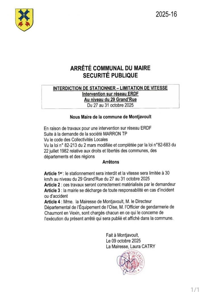 Bonjour, du 27 au 31 octobre, au niveau du haut de la Grand Rue, au numéro 29, il sera interdit de stationner et la vitesse sera très limitée, en raison de travaux ERDF chez un particulier. par admin | 24 Oct 2025 | Non classé | 0 commentaires